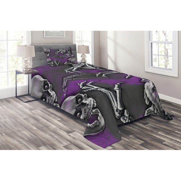 Skull Coverlet Set Twin Size Scary Creepy Spooky Happy Smiling Skeleton With Boned Hand Artwork Print Quilted 3 Piece Decor Bedspread Set With Pillow Sham Purple Grey And Black By Ambesonne